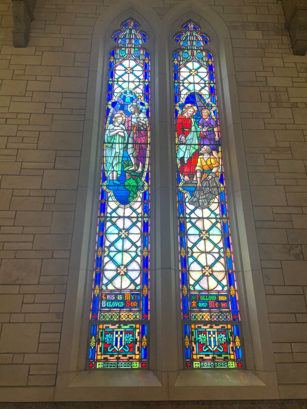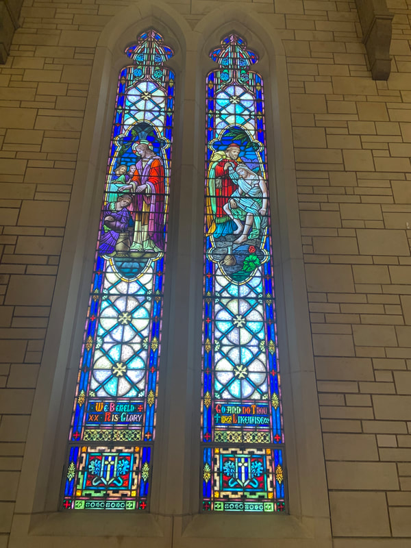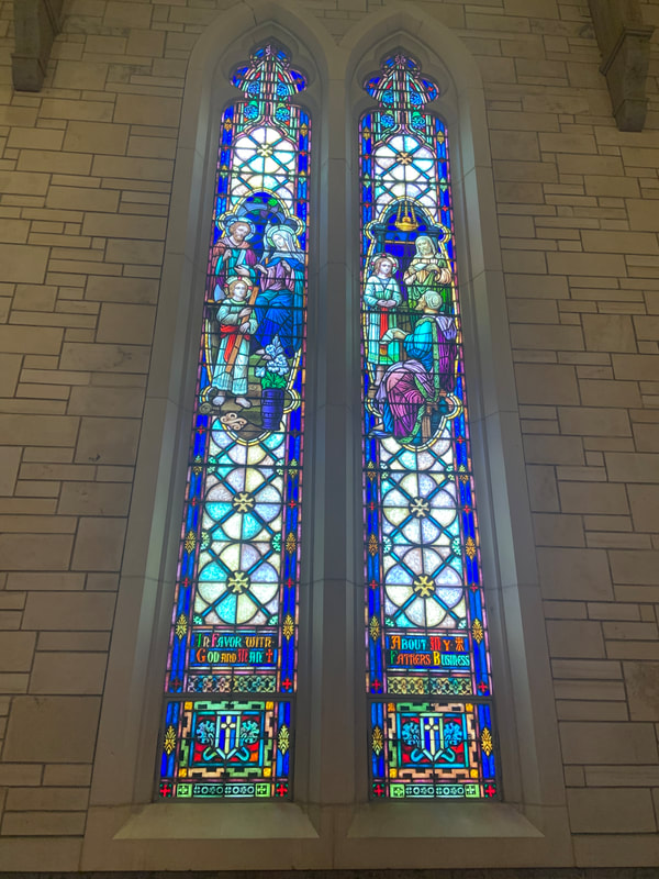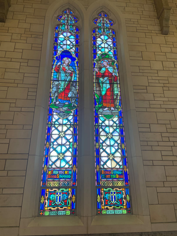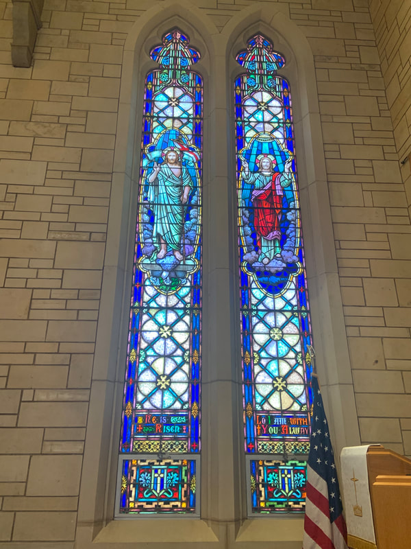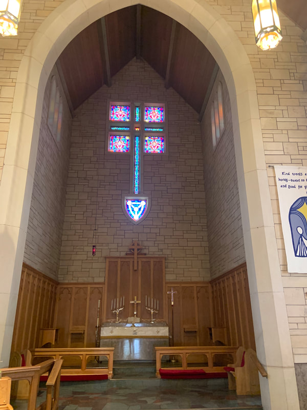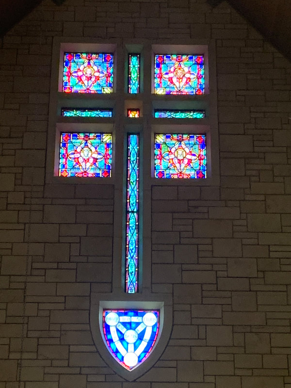 The nave and chancel windows are made of imported stained glass, the art work done by Jaco Art Glass Co. of St. Louis. The 18 foot windows of the chancel tell the story of the life of Christ in 14 pictures. Above the altar is the 13 foot art glass cross which symbolizes the visible elements of the Lord's Supper, with a chalice at the center of the cross. The cross basses on a shield which pictures the ancient Trinity symbol. The cross is flanked by the four evangelists' windows. There are three smaller Gothic windows to the north and the south of the chancel. These windows portray in fitting symbols the six chief parts of Christian doctrine. In the social room at the rear of the nave are the 4 major organization within the Lutheran Church, the Sunday School, the Walther League, the Layman's league, and the Women's Missionary League. The windows were completed in 1952 for a cost of $14,676. Today the windows are considered irreplaceable. (Thank you Gayle Christie for the photographs)